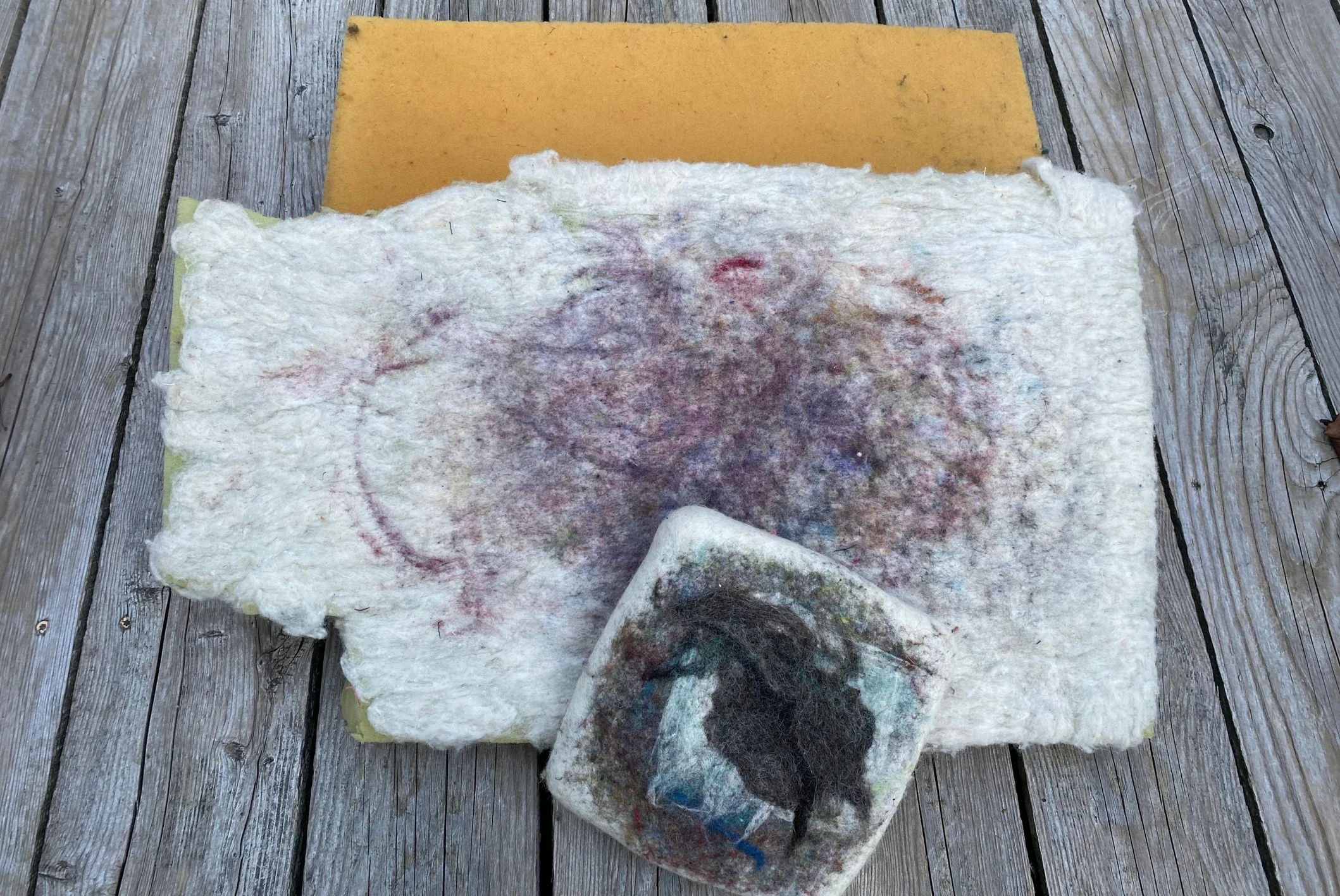 From back to front: a mostly unused piece of foam, a large piece of foam repaired with needle felting, a small pure wool felting board repaired with more wool.
